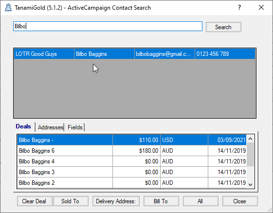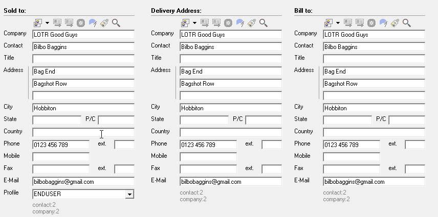 To add the contact details to the quote, select one of the address buttons. In this example, because we have customised the Ship To and change it to Delivery Address, that is the label used on the button. If you use the All button, the contact is added to all three address types.