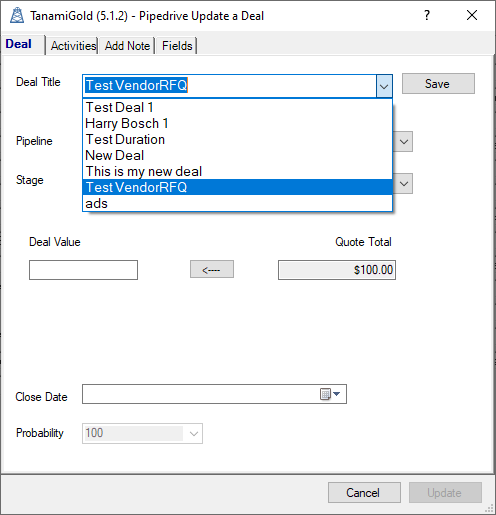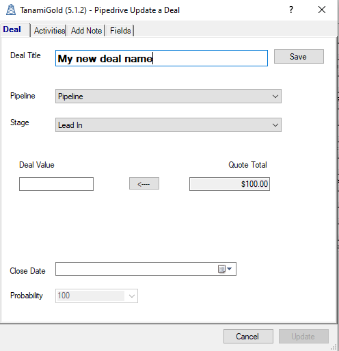 To create a new deal, either simply type the name in the text box, and select save, or use the "<-Name" button to add in the name of the quote.