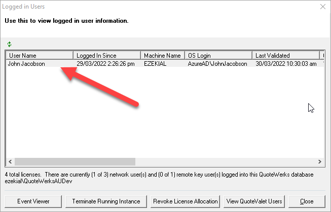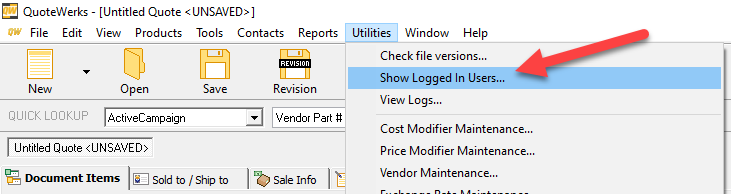 There may be a time when you choose to change your CRM application between these two options. When making this change, please ensure that all other users are not logged into QuoteWerks. You can check this via the Logged in Users window accessible from the Utiliies Menu.